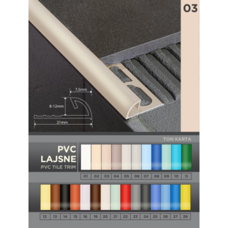 Lajsna bež boje širine 8 mm koristi se za polaganje keramičkih pločica. Spada u kategoriju profila i završnih letvica i pripada EN seriji. Izrađena je od visokokvalitetne plastike, što osigurava njenu izdržljivost i otpornost na habanje.